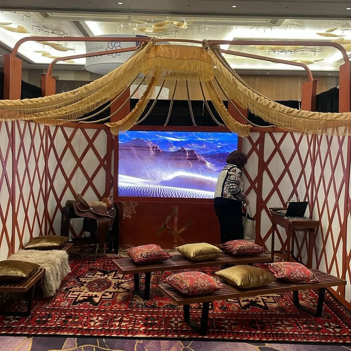 It remains one of my favorite experiences because destinations often go above and beyond to curate the sights, sounds, and emotions travelers will encounter. For example, Middle Eastern countries like Saudi Arabia transport you instantly into the desert: booths adorned with rich carpets, intricate lanterns, and golden-hued fabrics evoke the vast dunes that stretch endlessly, shifting with the wind and embodying a sense of timeless wonder.
